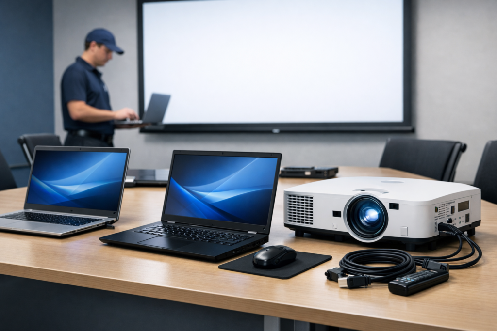 Um projetor multimídia de alta luminosidade aliado a um notebook potente transforma uma simples sala de reunião em um ambiente de aprendizado dinâmico. A clareza visual é fundamental para manter o engajamento dos colaboradores.